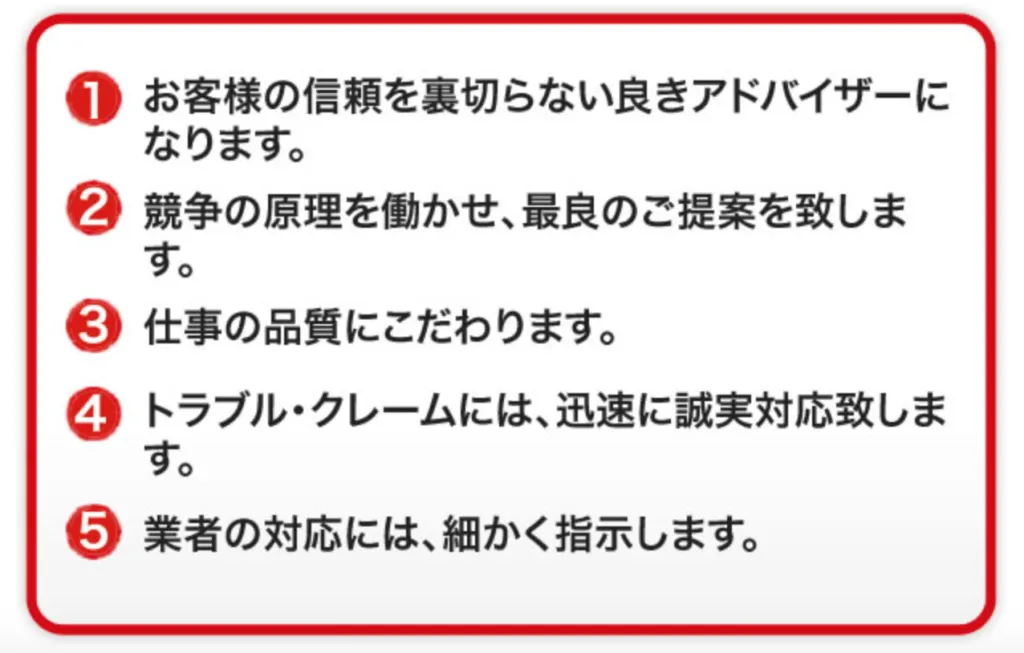 お客様の信頼を裏切らない良きアドバイザーになります。 競争の原理を働かせ、最良のご提案を致します。 仕事の品質にこだわります。 トラブル・クレームには、迅速に誠実対応致します。 業者の対応には、細かく指示します。