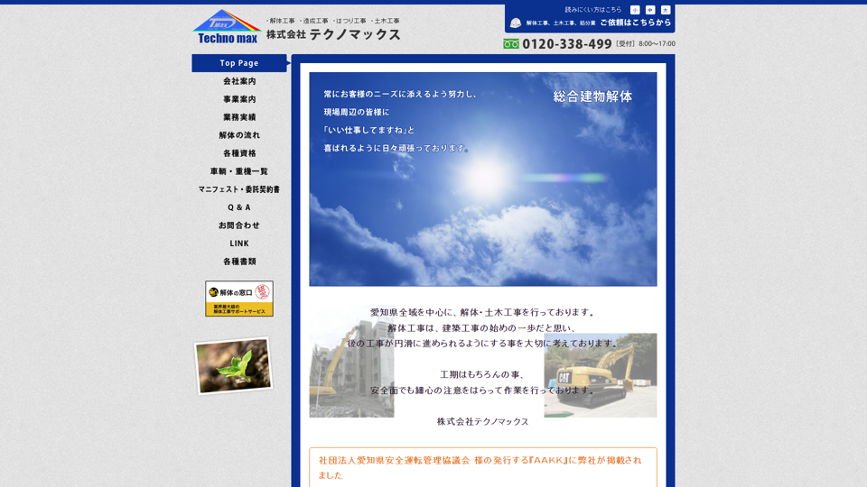 | 資格・許可 | 建築・解体業:特定建設業許可(特‐4)第6211号|産業廃棄物:産業廃棄物収集運搬業許可第02300019993号 |