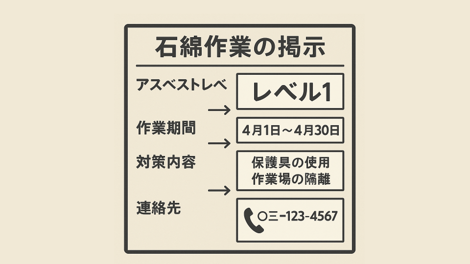 - 掲示板の設置: 工事現場の見やすい場所に、アスベスト作業中であることを示す掲示板を設置する義務。