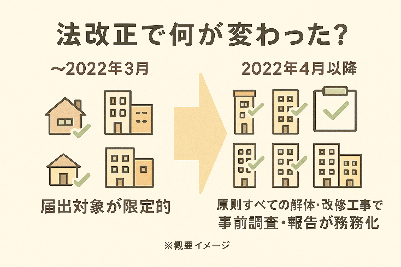 例えば、2022年の法改正で、一定規模以上の解体工事ではアスベストの有無に関わらず、専門家による事前調査と行政への報告が義務化されました。これは「施主の負担が増えた」のではなく、「施主や近隣住民が、アスベストのリスクについて一人で悩まなくてよくなった」という大きな進歩なのです。
