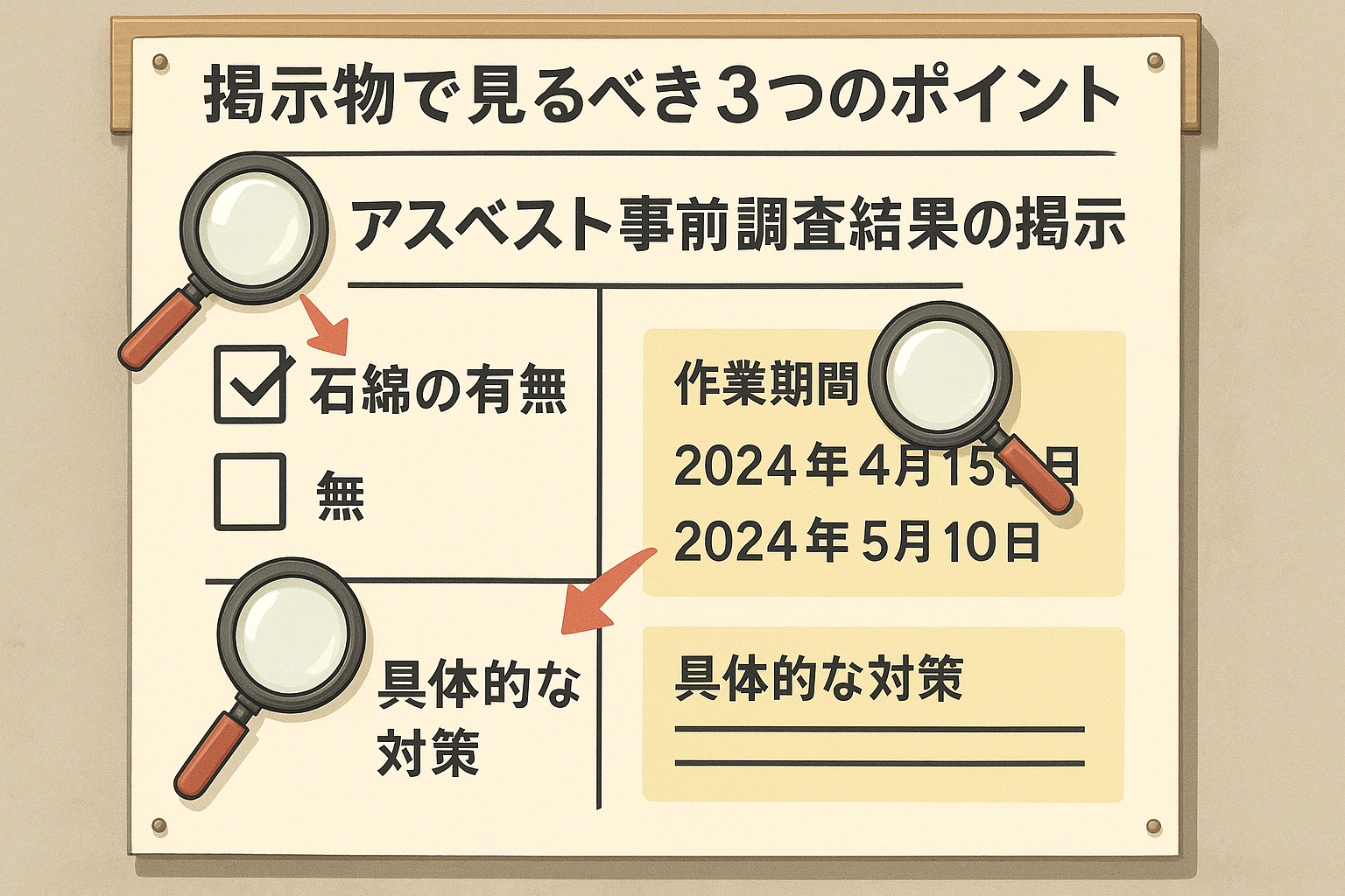 • 石綿(アスベスト)の有無: 「石綿なし」と書かれていれば、ひとまず安心です。「石綿あり」の場合は、次の対策内容を必ず確認しましょう。