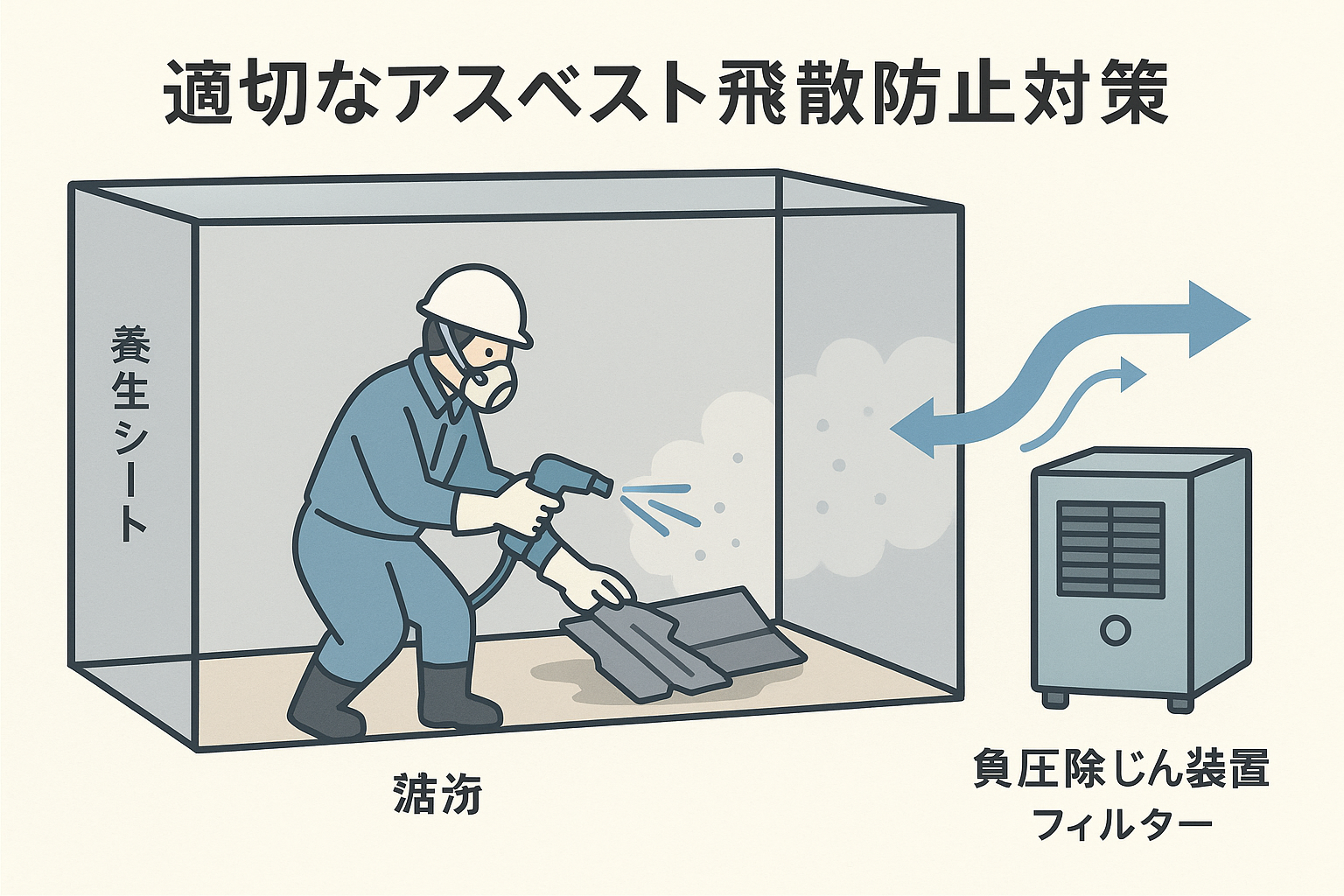 ただし、これはあくまで「対策が不十分な場合」の話です。現在の法律では、アスベストのレベルに応じて厳重な飛散防止対策が義務付けられています。例えば、作業場を密閉し、内部の気圧を低く保つ「負圧除じん装置」の使用や、作業中の継続的な散水(湿潤化)などが行われます。これらの対策が適切に講じられていれば、アスベストの飛散は工事現場の敷地内に封じ込めることが可能です。
