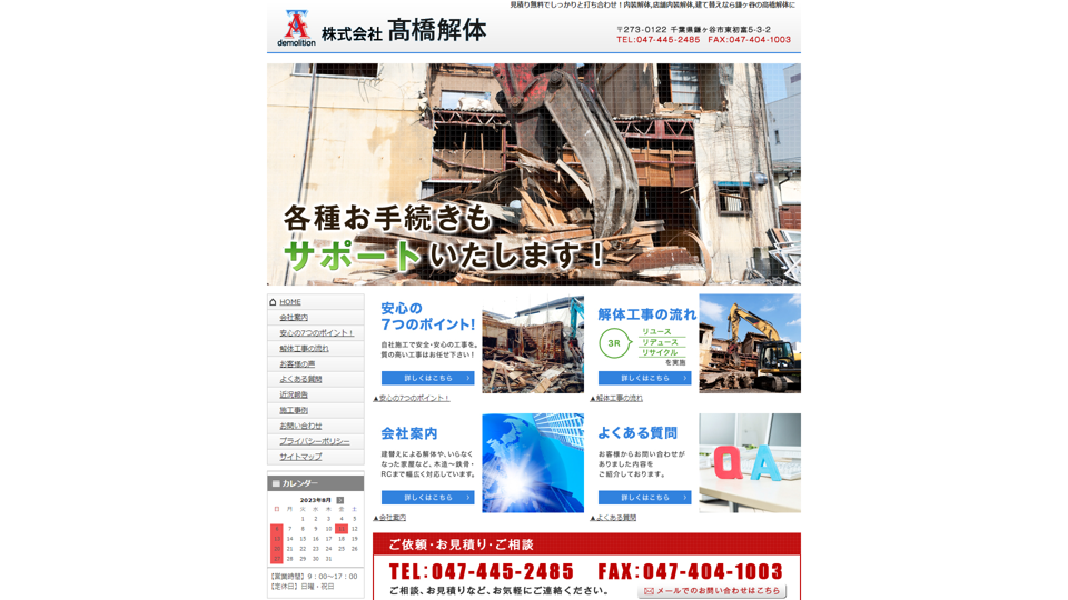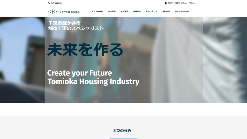 | 資格・許可 | 建築・解体業:千葉県知事許可(特-4)第55841号|産業廃棄物:第187420号(千葉県、東京都、神奈川県、埼玉県、茨城県) |