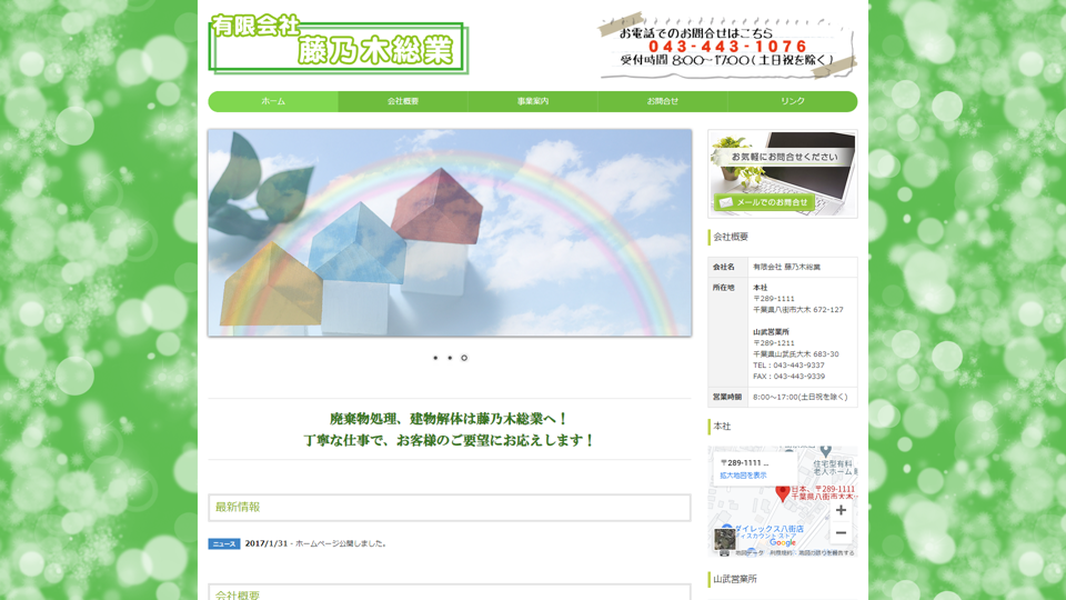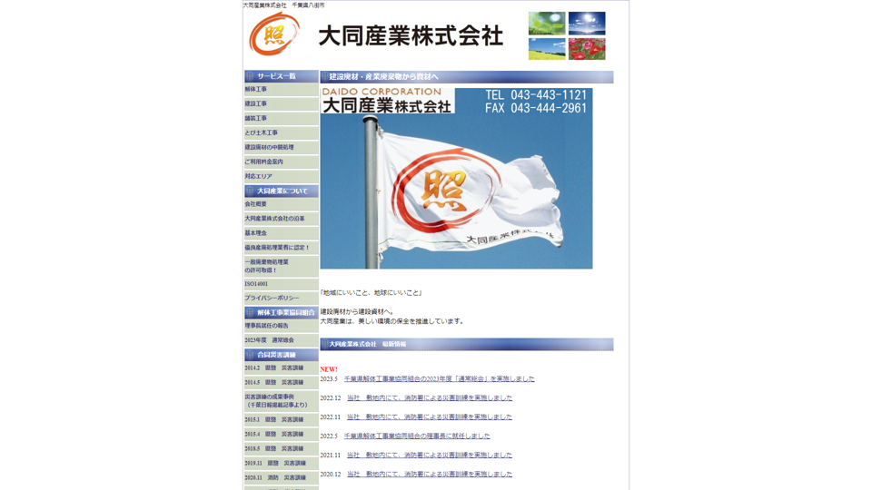 | 資格・許可 | 建築・解体業:千葉県知事許可(特-22)第19905号 千葉県知事許可(般-19)第19905号 |産業廃棄物:千葉県知事許可番号第01220003541号 東京都知事許可番号第13-00-003541号 |