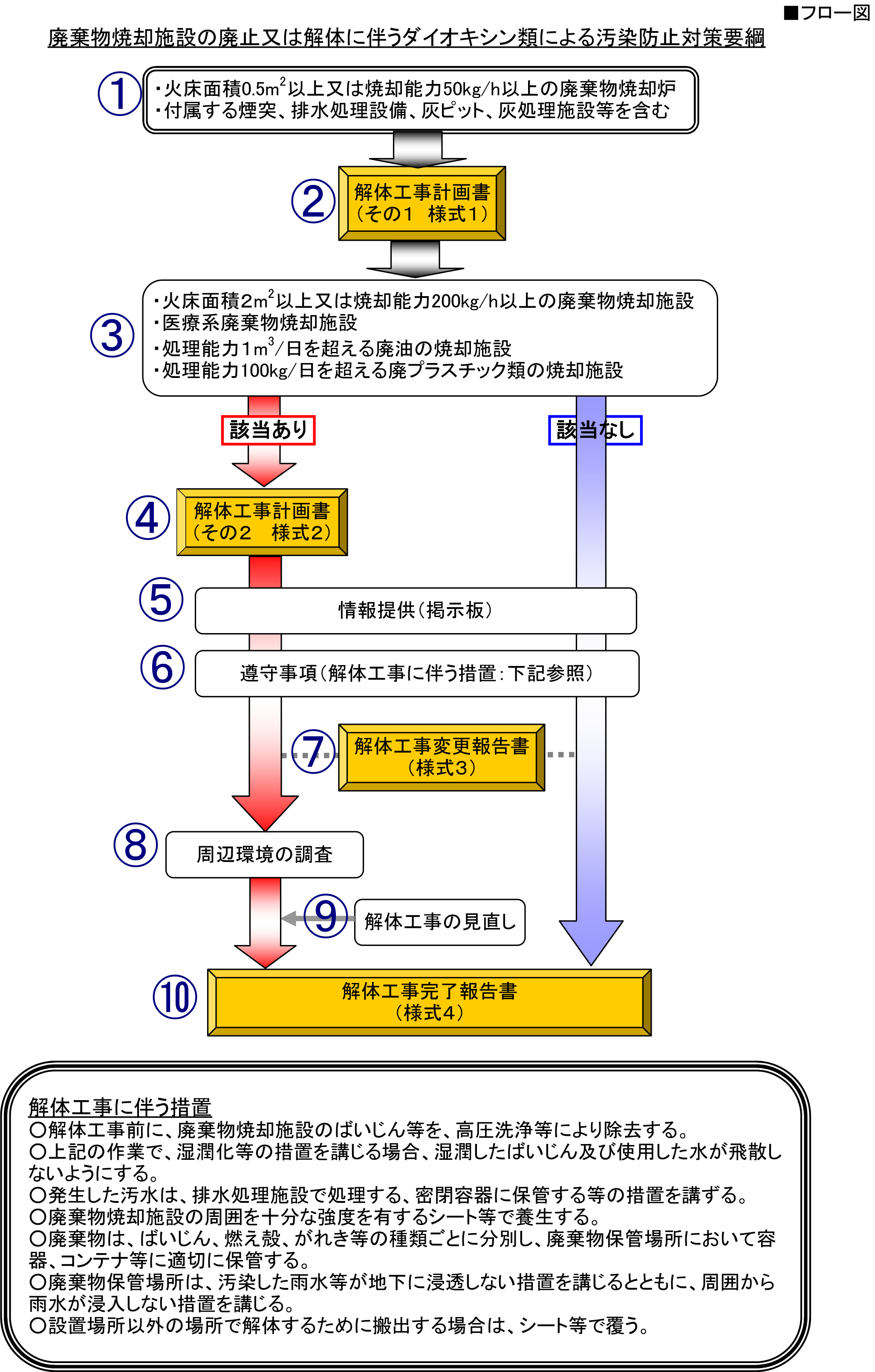 焼却炉など廃棄物処理施設の解体工事にあたっては以下のフローで取り組む必要があります。