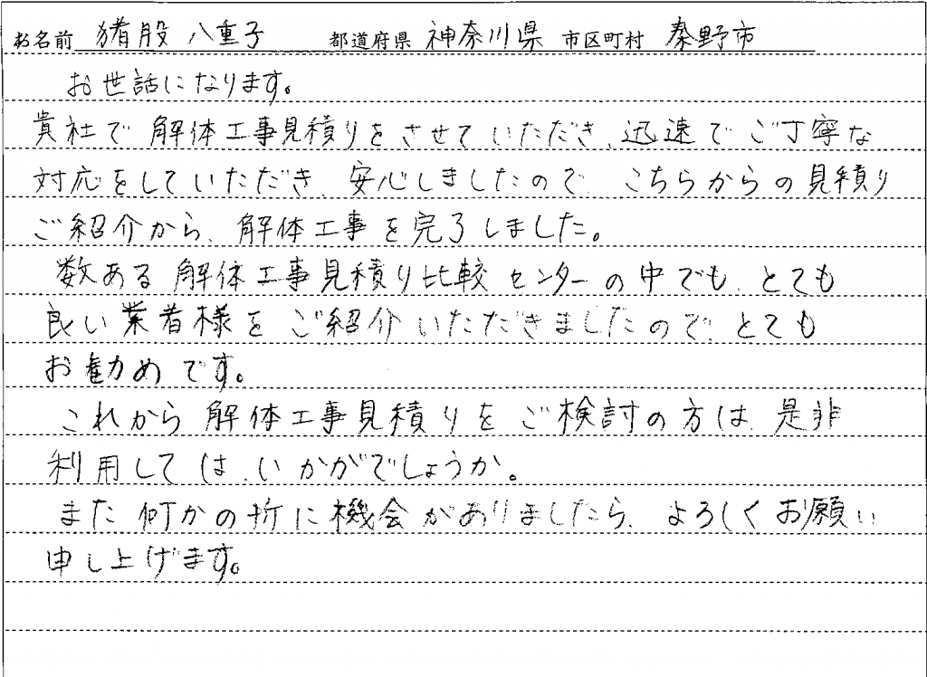 貴社で解体工事見積りをさせていただき、迅速でご丁寧な対応をしていただき、安心しましたので、こちらからの見積りご紹介から、解体工事を完了しました。