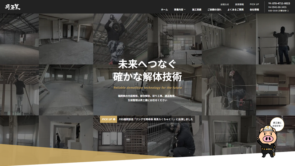 | 資格・許可 | 建築・解体業:福岡県知事許可第116076号福岡県知事第466号佐賀県知事第293号|産業廃棄物:許可番号04000196236 |