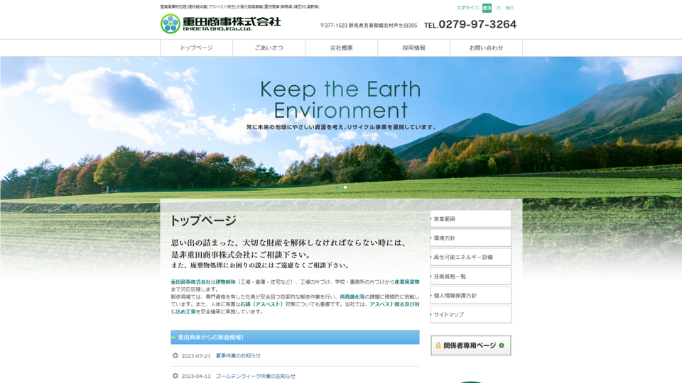 | 資格・許可 | 建築・解体業:群馬県知事許可(般-1)第20193号|産業廃棄物:群馬県産業廃棄物収集運搬業許可番号01000011403長野県産業廃棄物収集運搬業許可番号2009011403埼玉県産業廃棄物収集運搬業許可番号01104011403栃木県産業廃棄物収集運搬業許可番号00900011403東京都産業廃棄物収集運搬業許可番号第13-00-011403号 |