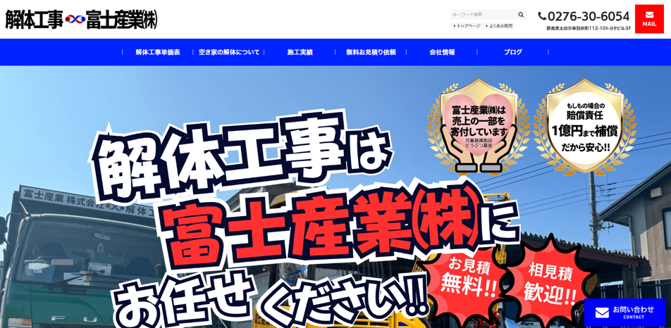 | 資格・許可 | 建築・解体業:群馬県知事(般−2)第25005号|産業廃棄物:群馬県知事東環第331-6号栃木県知事00900215124埼玉県知事01100215124 |