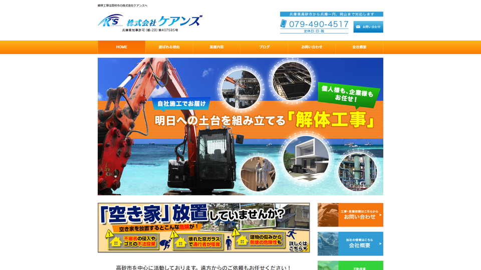 | 資格・許可 | 建築・解体業:兵庫県知事許可(般-28)第407585号|産業廃棄物:兵庫第02804165959号岡山第03300165959号 |