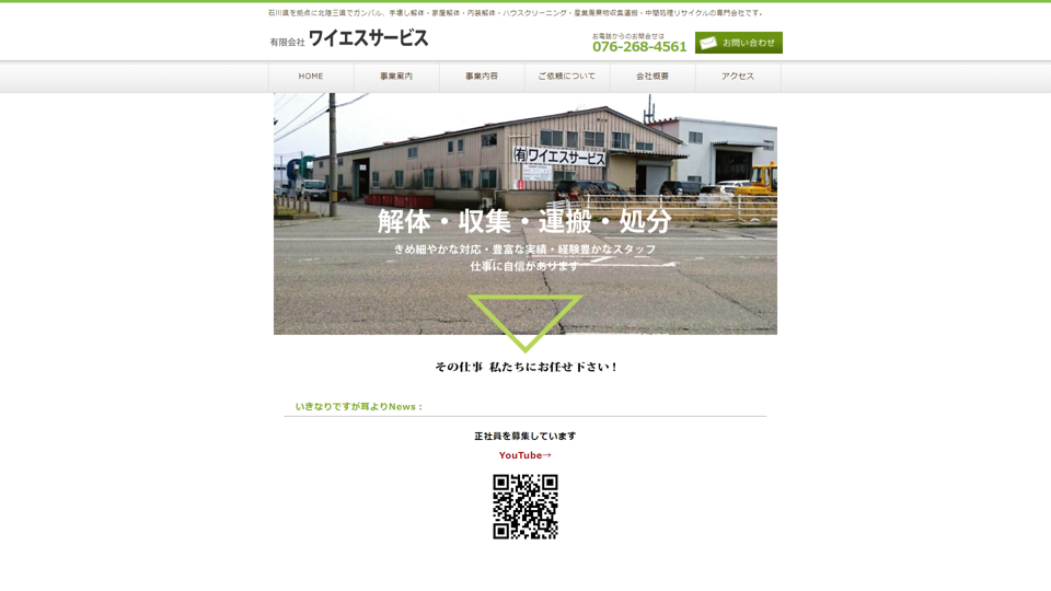 | 資格・許可 | 建築・解体業:石川県知事許可(般一2)第12943号|産業廃棄物:石川県第01722100304号 |