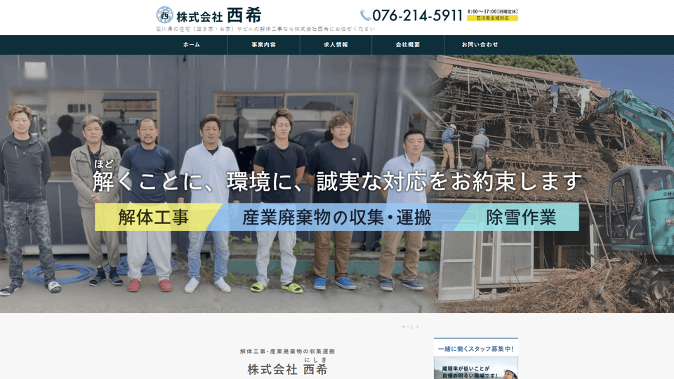 | 資格・許可 | 建築・解体業:石川県知事(般2)第14802号|産業廃棄物: |