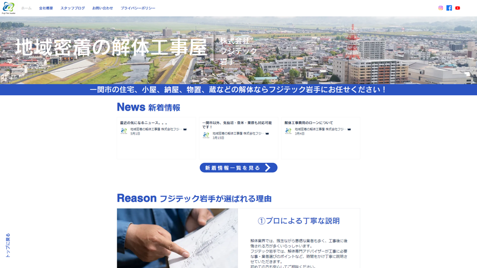 | 資格・許可 | 建築・解体業:岩手県知事許可(特・般-4)第8144号|産業廃棄物:産業廃棄物収集運搬業0302108179 |