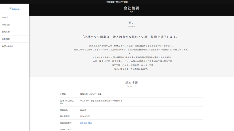 | 資格・許可 | 建築・解体業:岩手県知事(般-30)第20771号|産業廃棄物: |