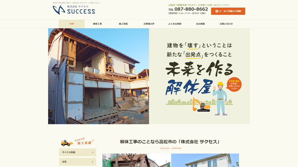 | 資格・許可 | 建築・解体業:香川県知事許可(般-4)第9952号|産業廃棄物:産業廃棄物収集運搬業許可第03703212778号 |