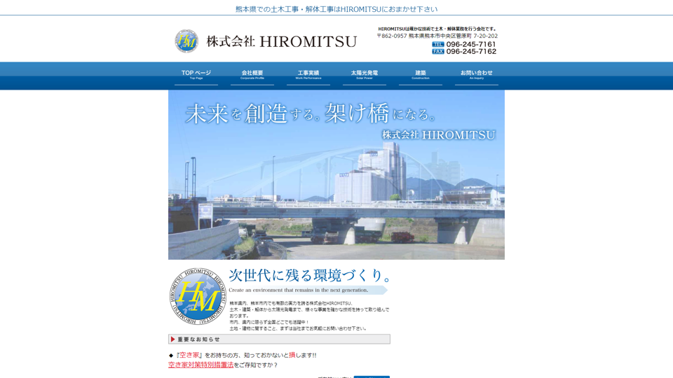 資格・許可建築・解体業:鹿児島県知事(とび土工)般-27第15931号鹿児島県知事(解体工事)般-28第15931号|産業廃棄物:産業廃棄物収集運搬業許可鹿児島県04604166587号産業廃棄物収集運搬業許可熊本県04305166587号産業廃棄物収集運搬業許可宮崎県04504166587号一般廃棄物収集運搬業許可出水市1141121801号
