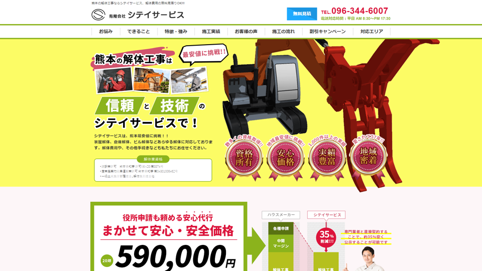 | 資格・許可 | 建築・解体業:熊本県知事許可(般-28)第8874号|産業廃棄物:熊本県知事第04301006462号 |
