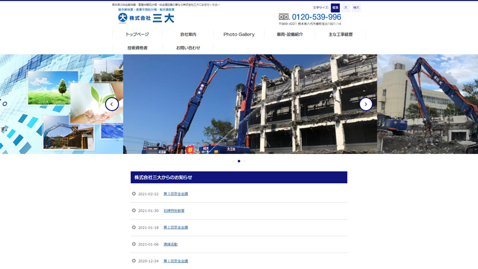 | 資格・許可 | 建築・解体業:熊本県知事般-2第12943号|産業廃棄物:熊本県許可番号4301047391号 |
