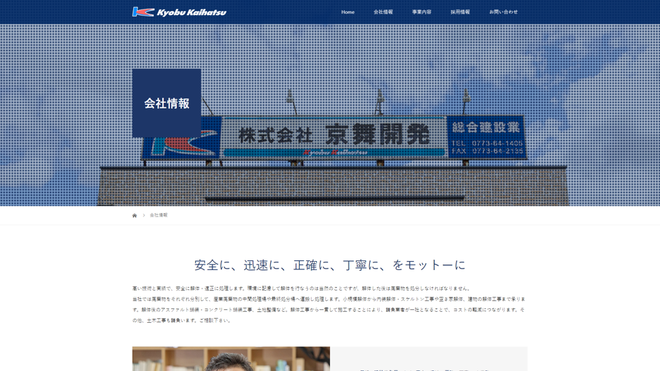 | 資格・許可 | 建築・解体業:京都府知事許可(般-3)第40811号|産業廃棄物: |