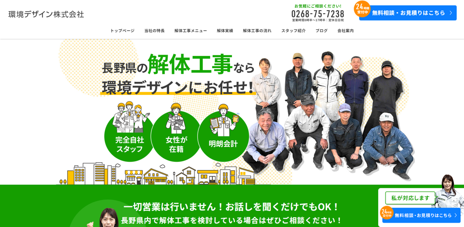 | 資格・許可 | 建築・解体業:一般建設業許可長野県知事許可(般-1)第25832号|産業廃棄物:産業廃棄物収集運搬業許可証許可番号2001168303 |