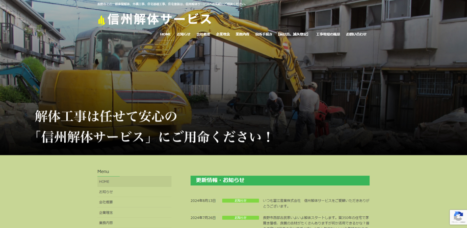 | 資格・許可 | 建築・解体業:建設解体業長野県知事(登-31)第928号|産業廃棄物:産業廃棄物収集運搬業第02001147333号 |