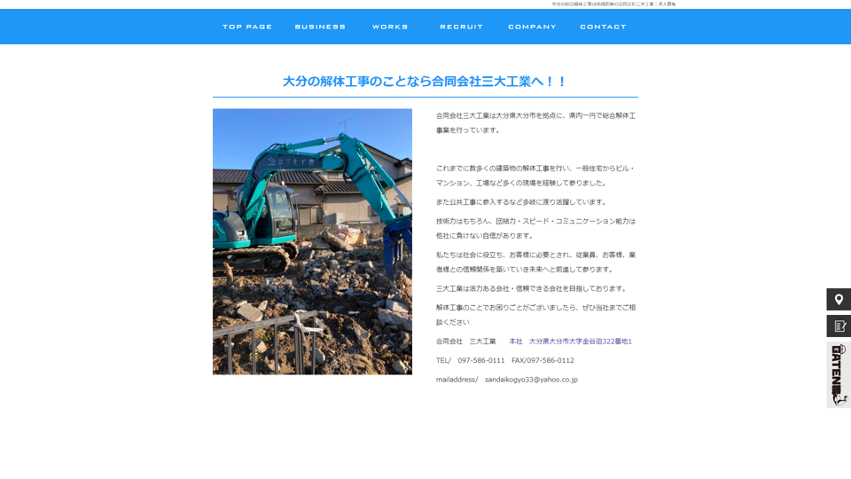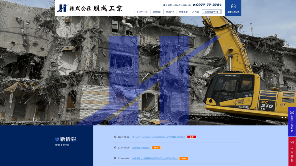 | 資格・許可 | 建築・解体業:大分県知事許可(般ー5)第15094号解体工事業の登録大分県知事(登ー3)第531号|産業廃棄物:産業廃棄物収集運搬業許可04402222445 |
