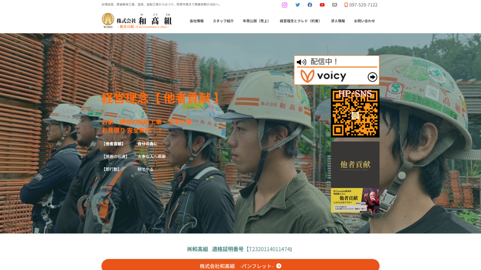 | 資格・許可 | 建築・解体業:大分県知事許可(般-4)第10712号|産業廃棄物:産業廃棄物運搬業:大分県知事許可4402010457号 |