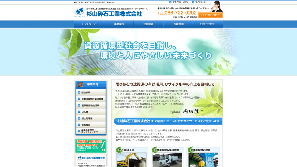 | 資格・許可 | 建築・解体業:岡山県知事許可(登-3)第555号|産業廃棄物: |