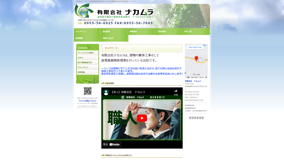 | 資格・許可 | 建築・解体業:佐賀県知事許可(特-3)第12334号|産業廃棄物:佐賀県収集運搬04115060319長崎県収集運搬04200060319福岡県収集運搬04000060319熊本県収集運搬04305060319山口県収集運搬03500060319 |