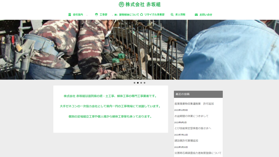 | 資格・許可 | 建築・解体業:滋賀県知事許可(特-27)第20056号|産業廃棄物:滋賀県知事許可第2540012717号岐阜県知事許可第02100012717号 |