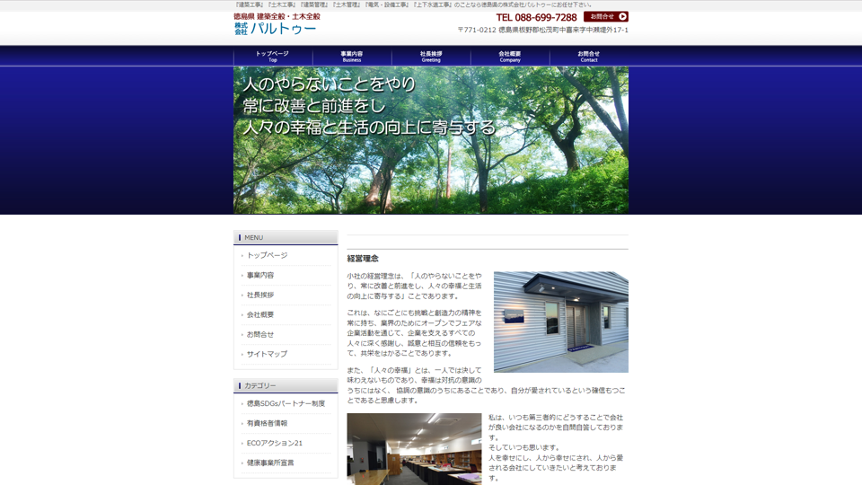 | 資格・許可 | 建築・解体業:徳島県知事許可(特-04)第6835号徳島県知事許可(般-04)第6835号|産業廃棄物:産業廃棄物収集運搬許可番号3600151548 |