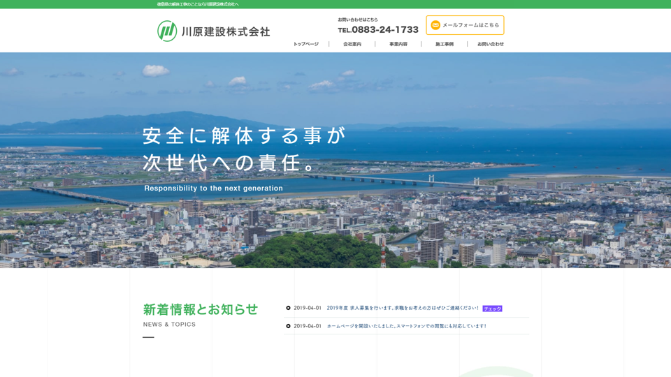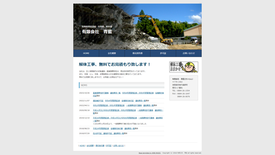 | 資格・許可 | 建築・解体業:徳島県知事許可(般-30)第30086号|産業廃棄物: |