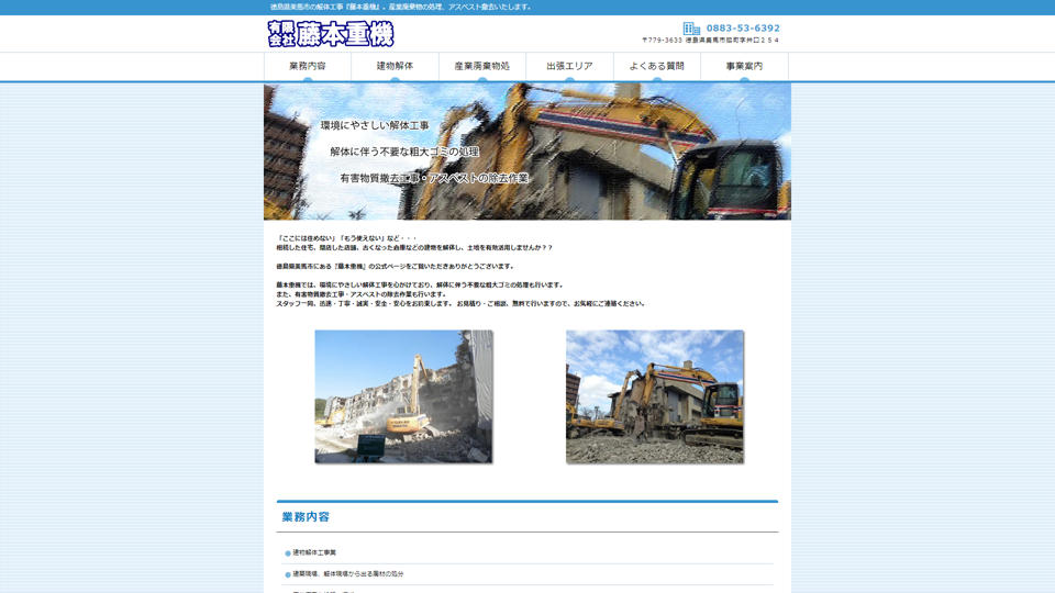 | 資格・許可 | 建築・解体業:徳島県知事許可(一般-28)第5307号|産業廃棄物:徳島県第03600155541号香川県第03708155541号愛媛県第03805155541号 |
