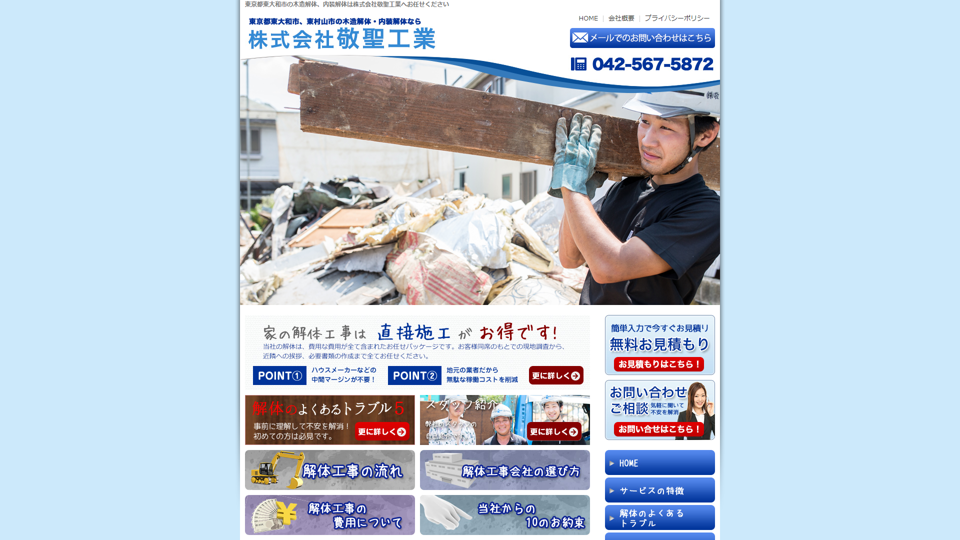| 資格・許可 | 建築・解体業:東京都知事許可(般-3)第134030号|産業廃棄物: |