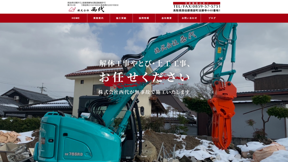 | 資格・許可 | 建築・解体業:鳥取県知事許可第7053号|産業廃棄物:産業廃棄物収集運搬業許可鳥取県03104190830/島根県03200190830 |