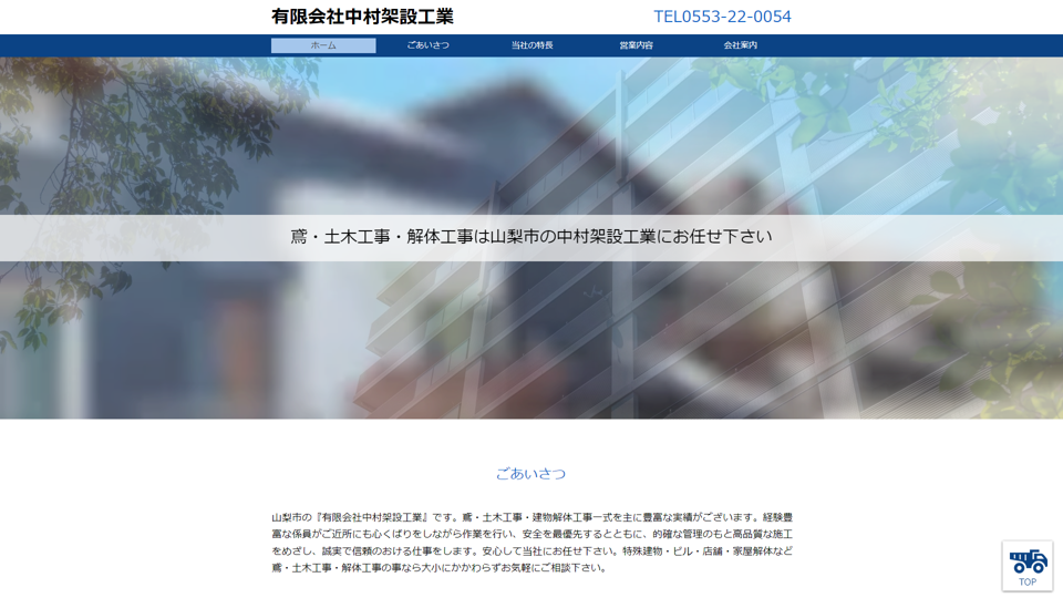 | 資格・許可 | 建築・解体業:建設業許可:山梨県知事(般-30)第8260|産業廃棄物:産業廃棄物収集運搬業許可証(許可番号01902005355号) |